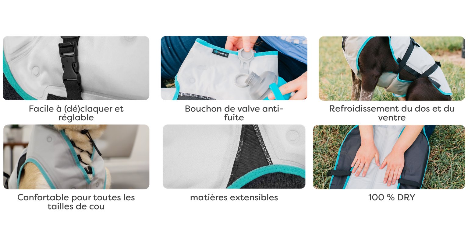 Il est essentiel que le DRY® Cooling Vest soit bien ajusté au dos et au ventre de votre chien. Sans contact direct, le refroidissement ne peut pas fonctionner efficacement. Cependant, veillez à ce que le gilet ne soit pas trop serré, afin que votre chien puisse respirer librement et rester à l’aise.