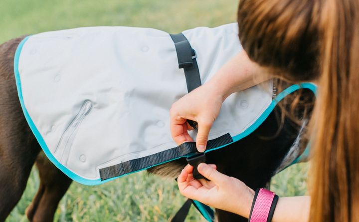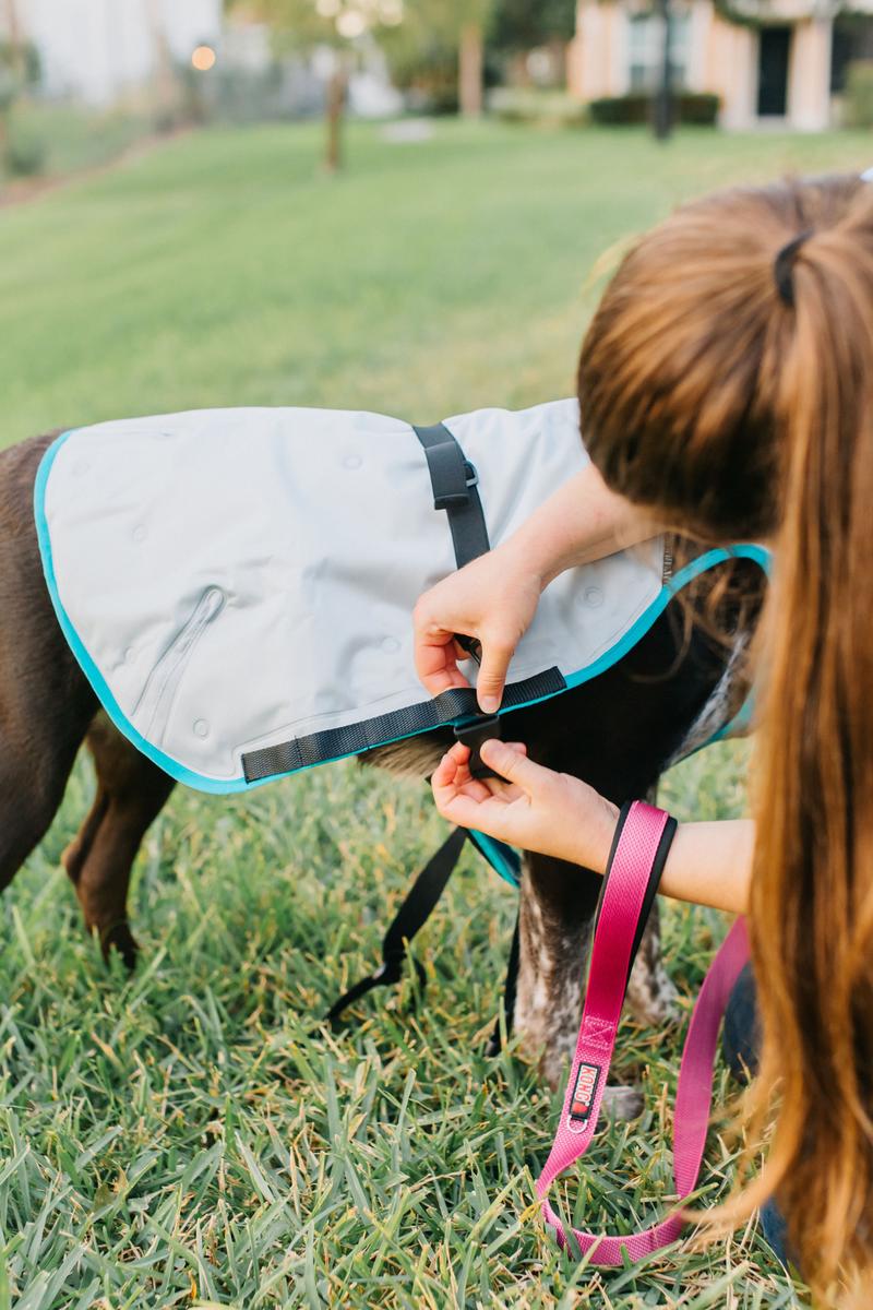 De verstelbare elastische banden rond de nek en de handige gespsluitingen zorgen voor een perfecte pasvorm voor bijna elk ras. Extra geleidelusjes aan de zijkanten houden het vest goed op zijn plaats terwijl je hond beweegt. Bekijk de video en leer hoe je het DCV aantrekt en je hond opmeet.